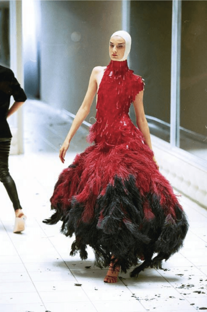 Throughout his career, he incorporated organic elements such as feathers, animal fur, shells, bones, and distressed leather to create designs that felt primal and raw. He often combined delicate fabrics like lace and chiffon with harsher materials, producing striking contrasts between fragility and aggression. In collections such as VOSS, he juxtaposed clinical, sterile staging with intricate textures, heightening the emotional intensity of his garments. By experimenting with a wide array of materials and techniques, McQueen managed to weave a narrative into the very fabric of his designs.